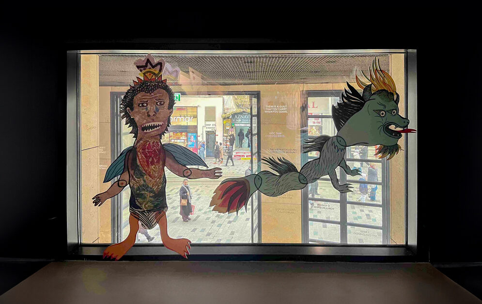 Hilal Can, ışık ve gölge oyununu yalnızca figürlerle sınırlı tutmuyor. Tepegöz performanslarından aşina olunan sahneleme dilini, sergi alanında daha geniş bir deneyim ortamına dönüştürüyor. Ürettiği karakterler, İstiklal Caddesi ile görsel ve düşünsel bir bağ kurarak sergi alanının sınırlarını dışarı doğru genişletiyor.